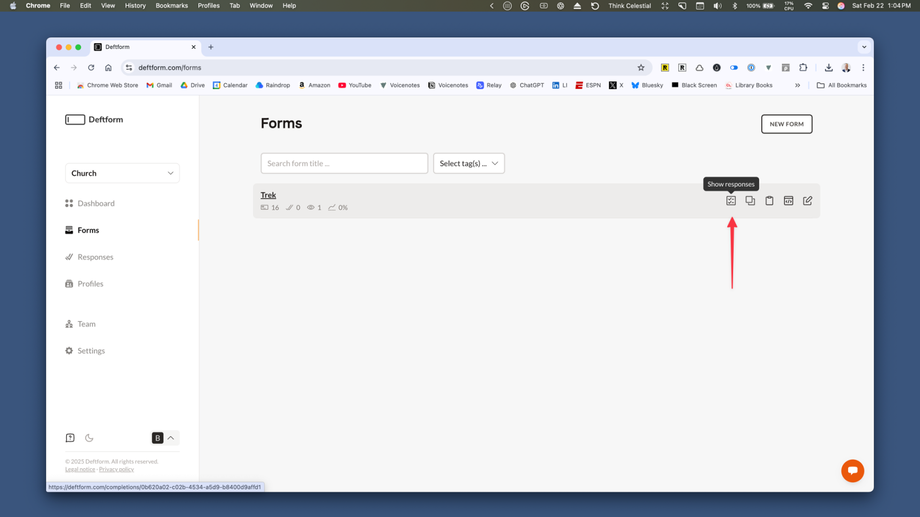 You can see all of your form's submissions when clicking on the icon that link to responses while viewing the list of forms.