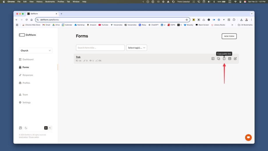 The easiest way to share your form is to copy the public link when viewing your forms in the Forms section (see screenshot below) and emailing or texting it out to people.